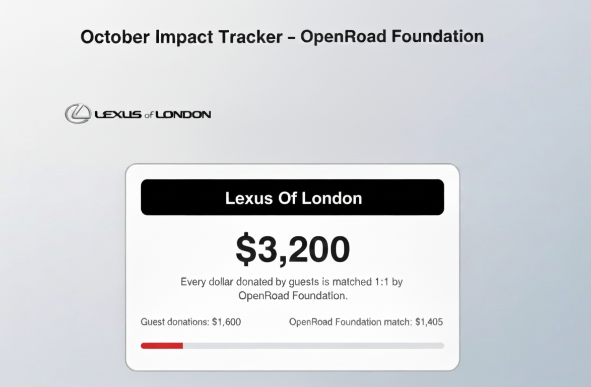At Lexus of London, giving back is at the heart of what we do. For every vehicle purchase or tire change, your donation is matched by OpenRoad Foundation—doubling your impact for families in need across our community.